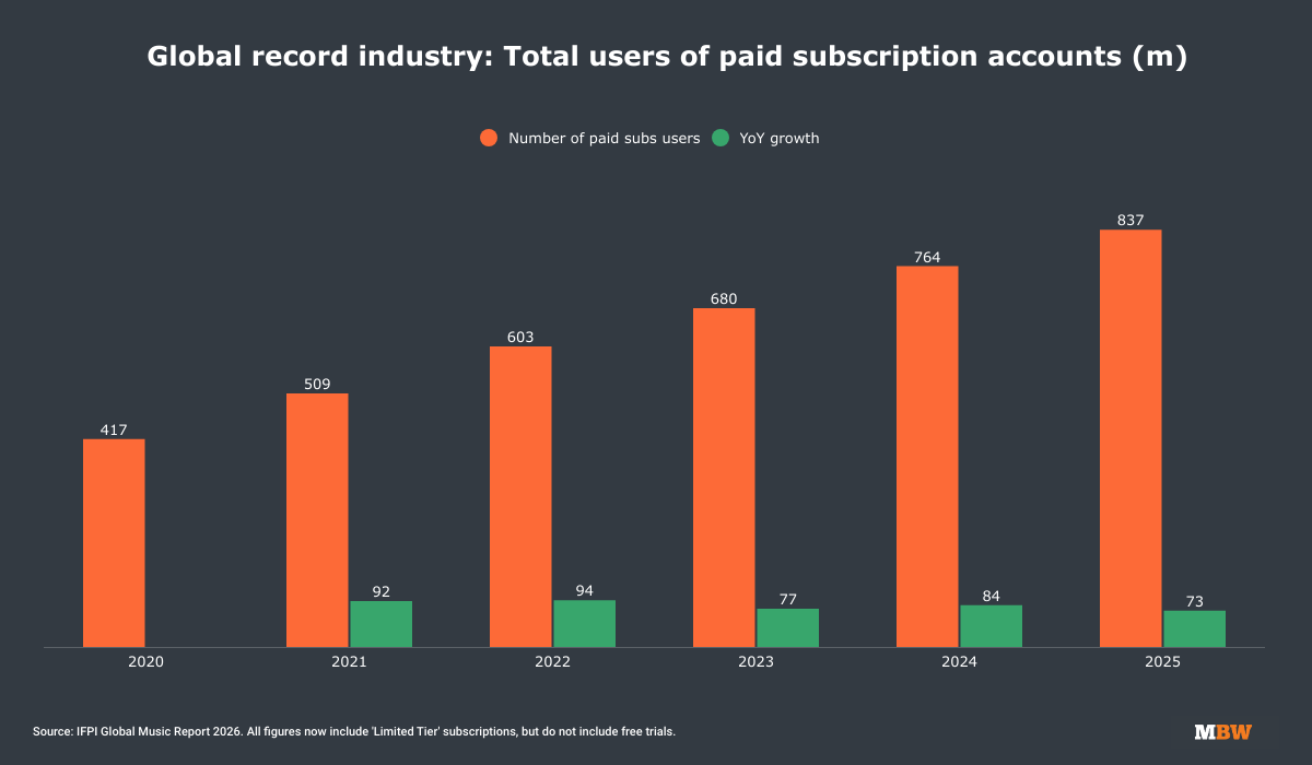 The total number of users of paid music streaming subscription accounts grew to 837 million globally in 2025, up from a restated 764 million in 2024 — an increase of 73 million accounts in a single year.
