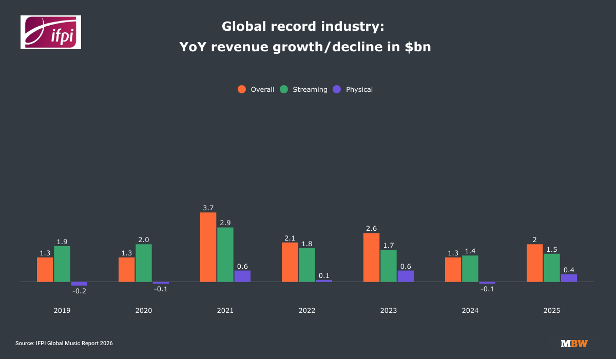 Notably, the rate of growth accelerated compared to the prior year. The IFPI previously reported that the global industry grew by 4.7% YoYin 2024, meaning the percentage growth of the business improved markedly in 2025.