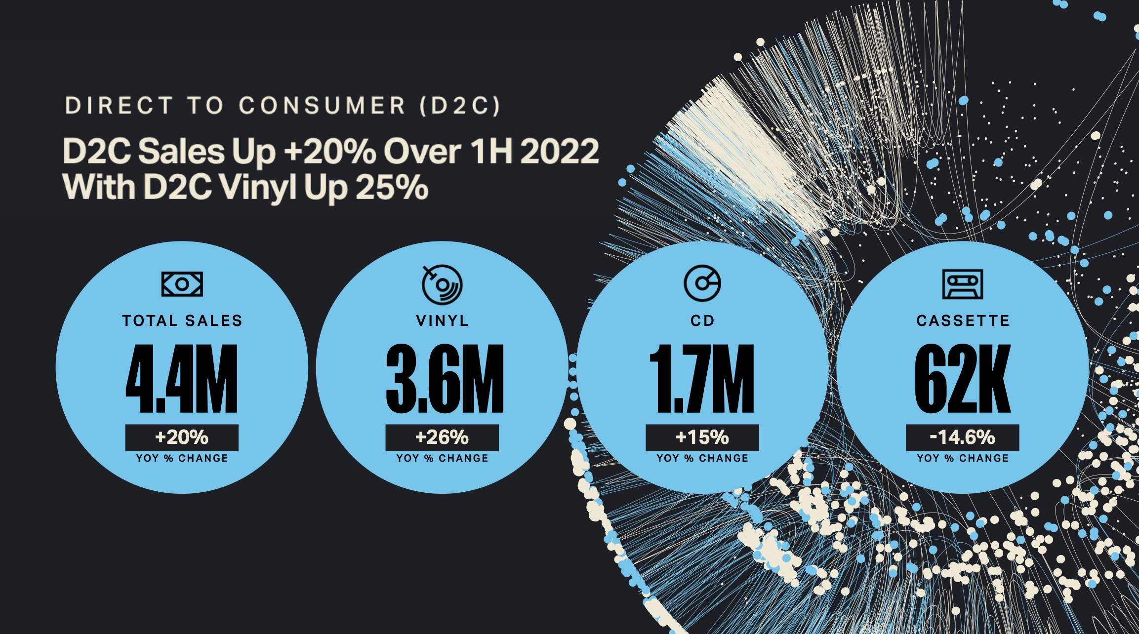 According to Luminate, D2C sales of music from artists’ stores were up over 20% in H1, with D2C vinyl sales up 26% YoY in H1, to 3.6 million copies. Meanwhile, 1.7 million CDs were sold Direct-to-Consumer in the first half of the year, an increase of 15% YoY (see below).
