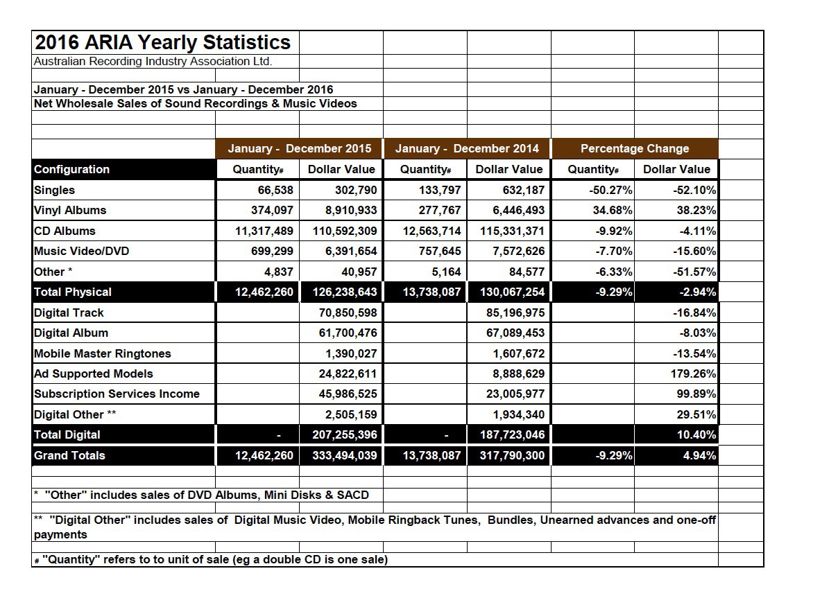Still, the figures from ARIA demonstrate the first growth in Australia’s recorded music market in three years – to AUS $333.5m (US $252m) – and come off the back of a 10% decline in 2014.