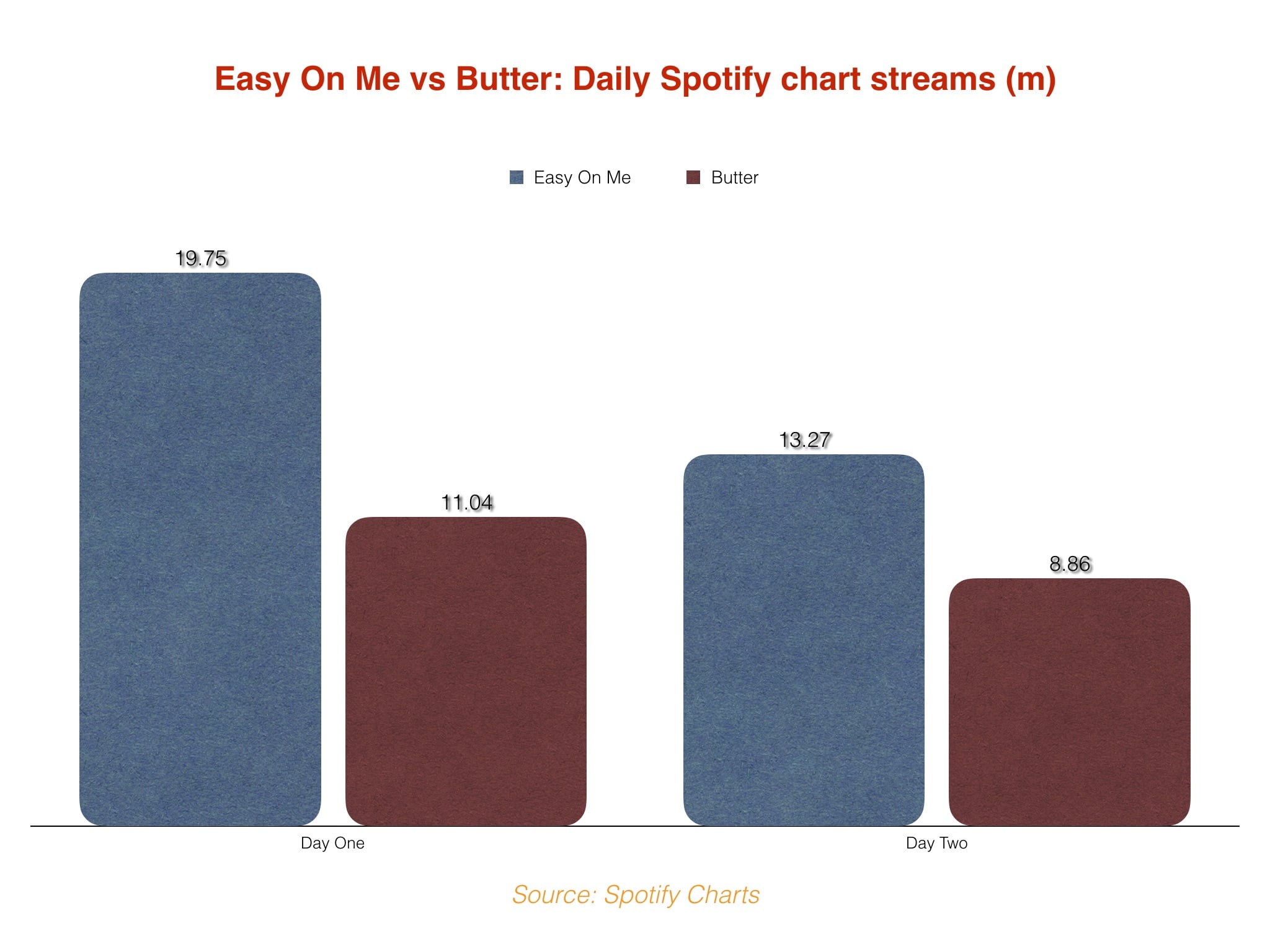 - (ii) Easy On Me (19.75m) clocked up nearly double Butter’s (11.04m) chart-eligible day-one Spotify streams.
