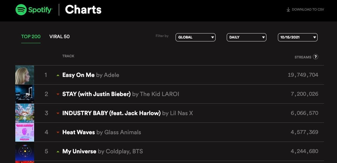 One last interesting bit of number crunching: Some 27.5% of Easy On Me’s day-one Spotify chart streams (5.435m) took place in the US, according to SpotifyCharts.com.