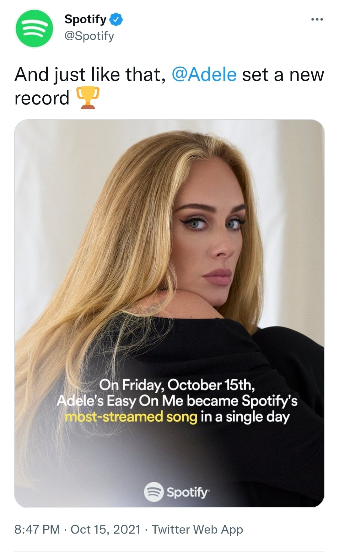 Also interesting: Spotify posted on social media that Easy On Me had become its biggest ever day-one record at precisely 8.47pm UK (3.47pm ET) on Saturday (October 15, see below).