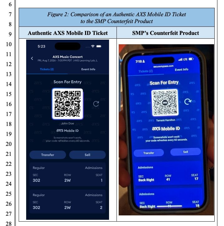 The lawsuit describes how AXS uses rotating QR codes, unique identification numbers, and digital watermarks to prevent ticket fraud. SecureMyPass allegedly copies these visual elements while bypassing AXS’s security infrastructure, creating what AXS calls “counterfeit products” that look authentic.