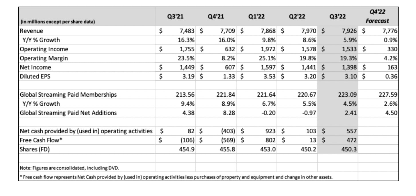 Looking forward, to Q4 2022, Netflix says it is expecting revenue of $7.8 billion with “the sequential decline entirely due to the continued strengthening of the US dollar vs. other currencies”, noting that “on a constant currency basis, this equates to 9% year-over-year revenue growth”.