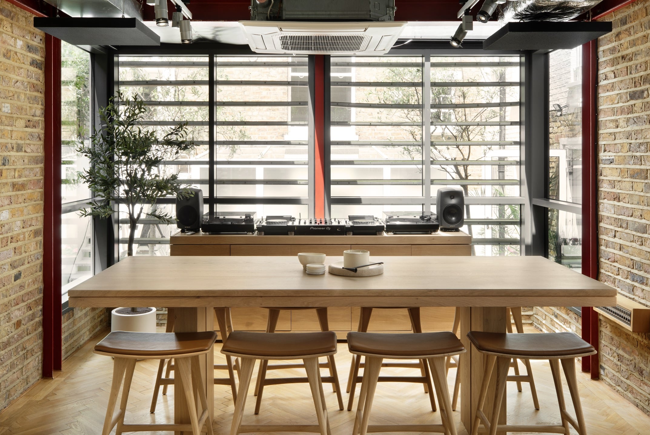 The lounge is outfitted with a high-end AV system, including Focal Trio 11 monitors and Pioneer CDJ300s. Three Six Zero says that the room is “ideal for album playbacks, events, and presentations”.