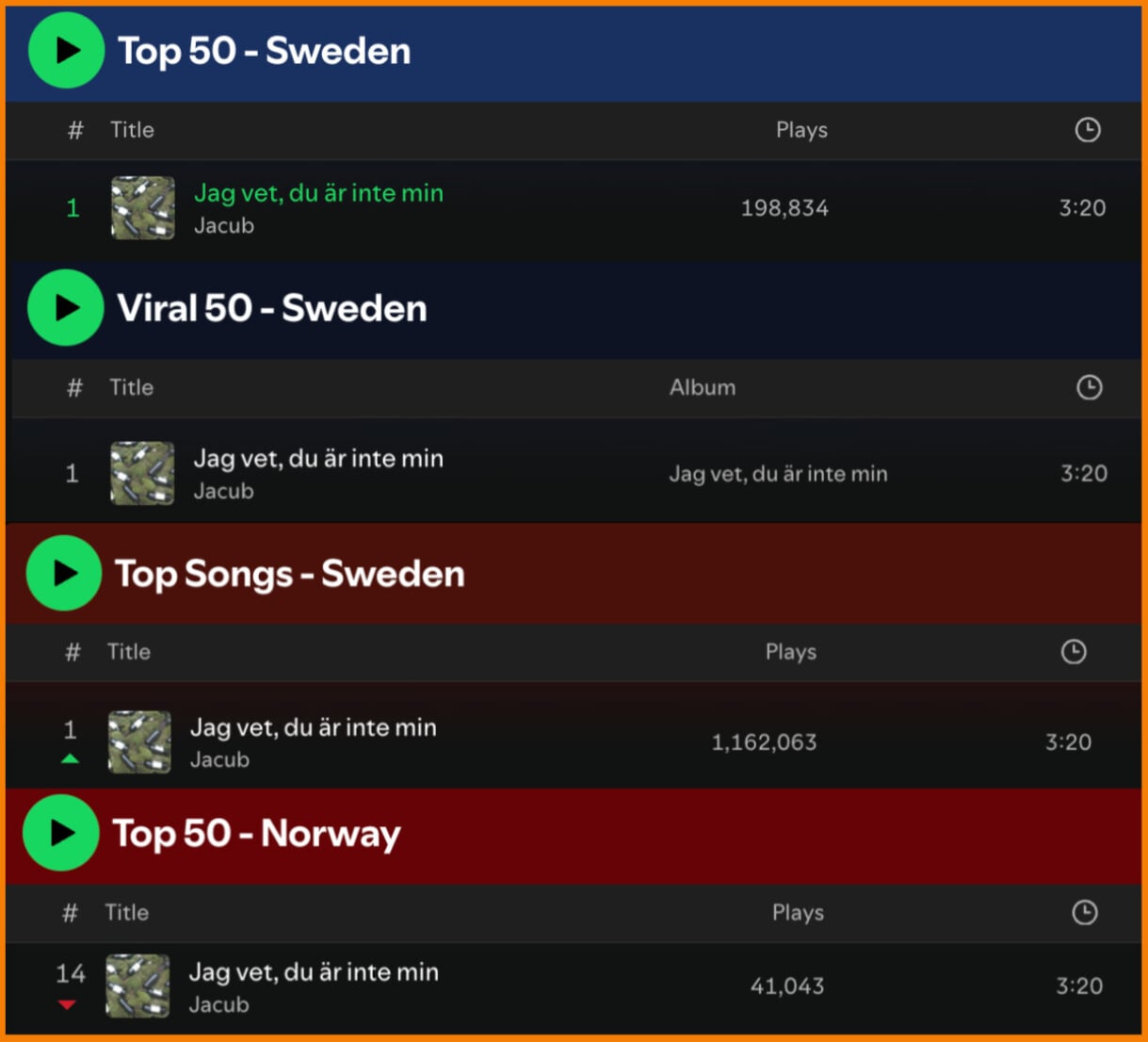 Jag vet, du är inte min by an artist called Jacub reached No. 1 on Spotify‘s Swedish Top 50 before music industry body IFPI blocked it from Sverigetopplistan. It also landed at No. 14 on Spotify’s Top 50 chart in Norway.