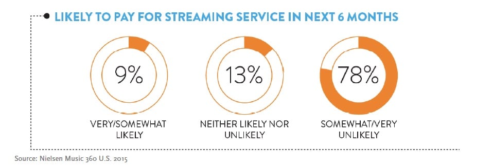 Another outcome from Nielsen’s 360 Music report was that 78% of all respondents said they were ‘somewhat or very unlikely’ to pay for a streaming service in the next 6 months.