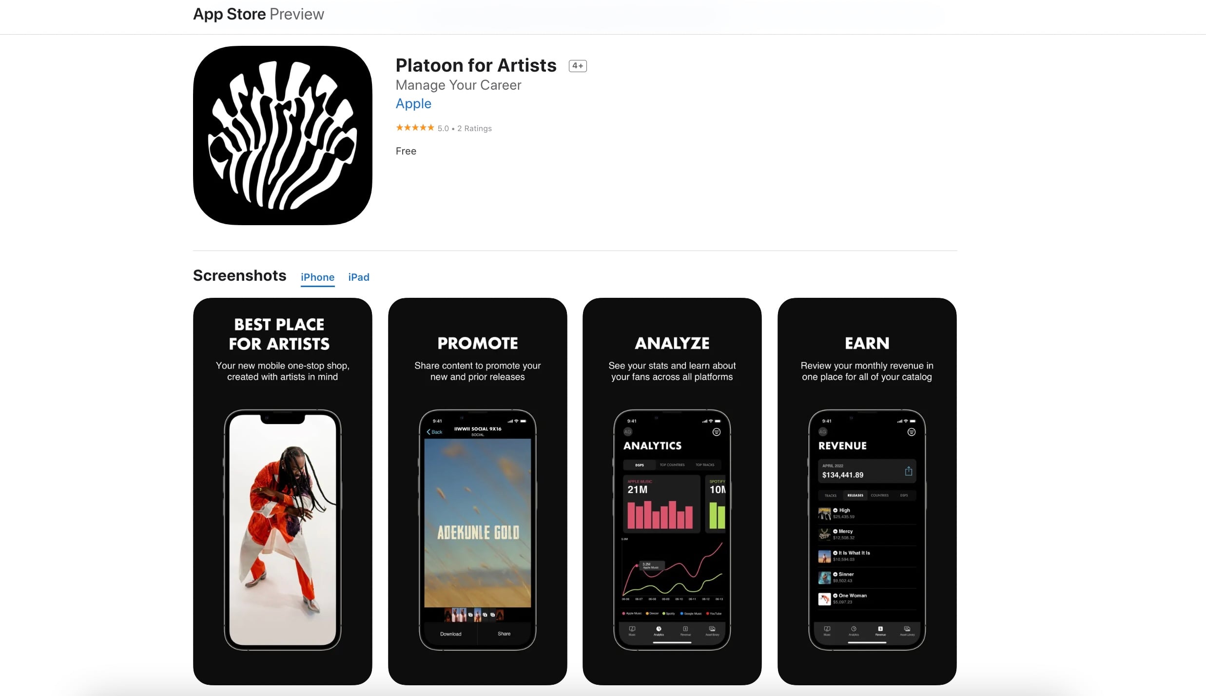 The invitation-only app’s app’s blurb on the App Store states the following: “Managing your artist career has never been easier. Platoon for Artists is your home to manage content, streams, revenue, and more.”