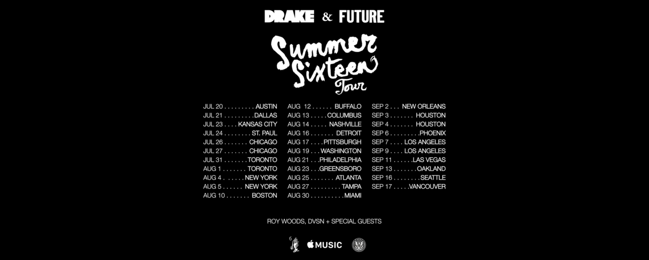 Drake and Future’s Summer Sixteen tour will see the duo plus special guests DVSN and Roy Woods play 32 North American dates in the US and Canada across July, August and September.