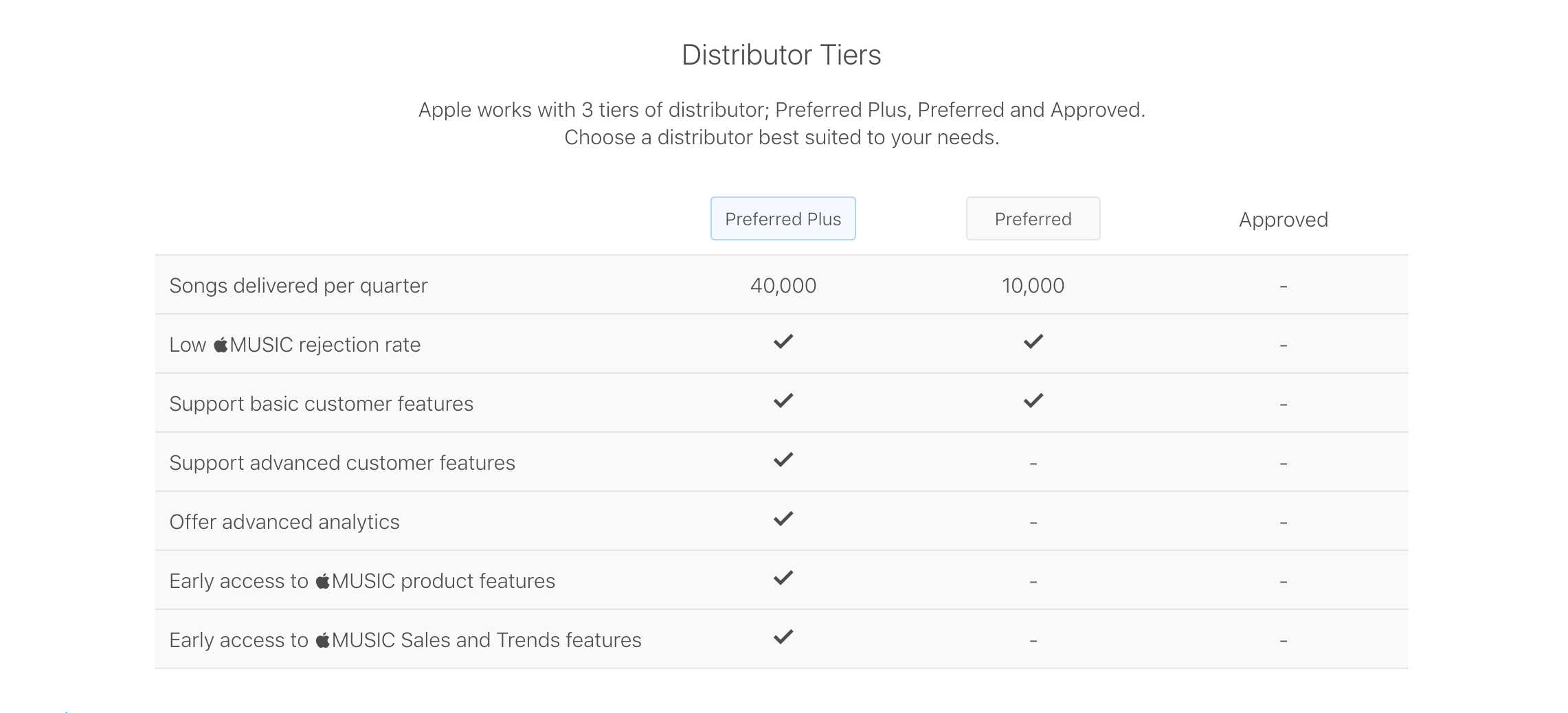 Preferred distributors only support “basic customer features” and a low Apple Music rejection rate.