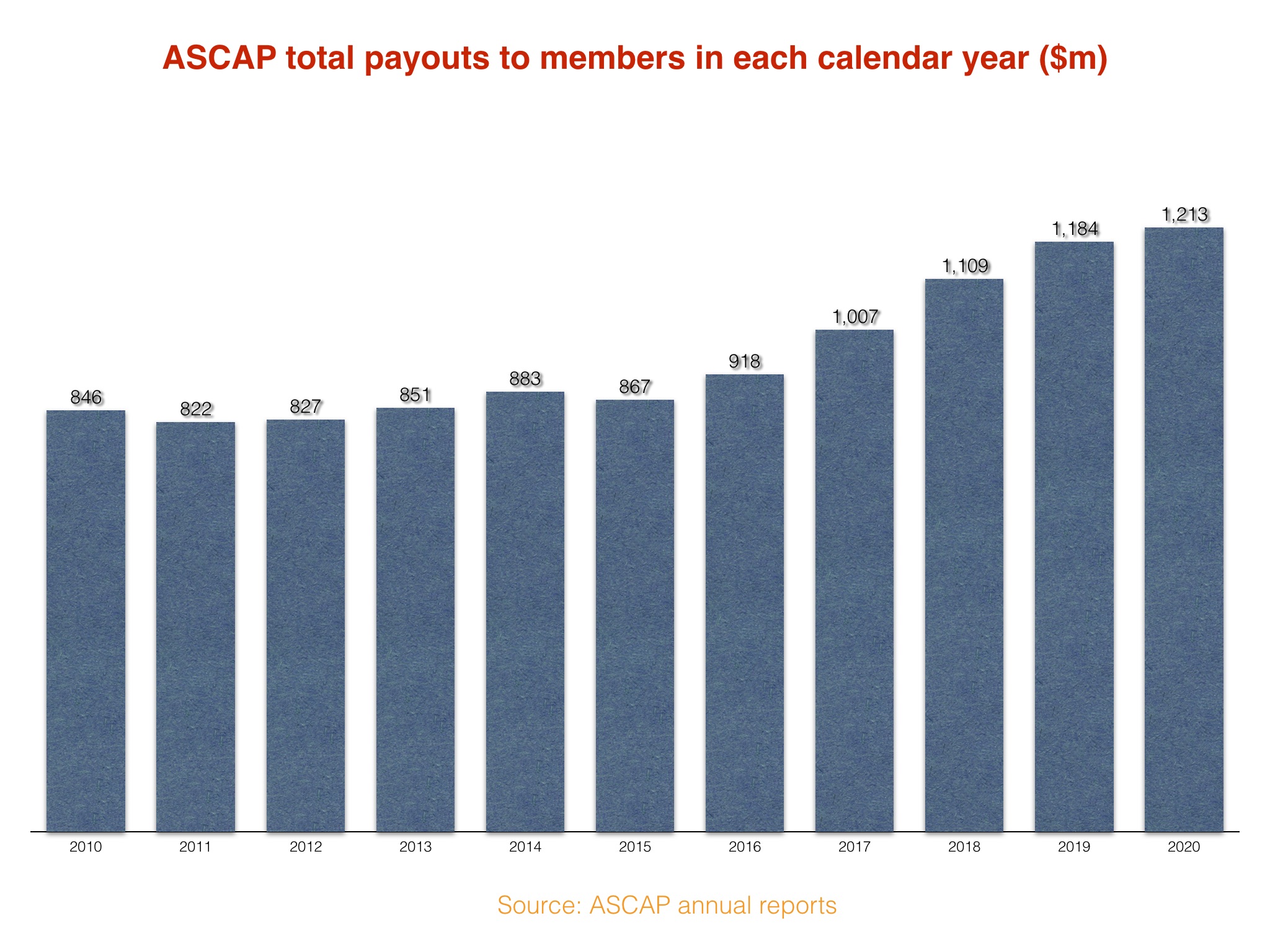 The mean average payout for each of the 800,000 ASCAP members in 2020 (from the body’s $1.123bn total distribution) was approximately $1,516. (Though obviously many of those 800,000 members – such as the three major music publishers and leading songwriters – would have been paid much more than this, while many others will have been paid less.)