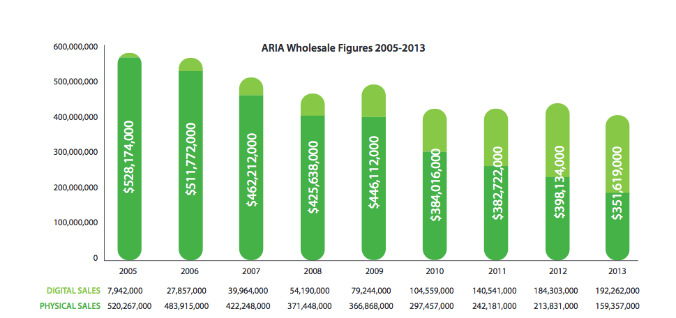 Revenues in the Australian recorded music business plummeted by 11.6% in 2013, according to the latest wholesale figures from the Australian Recording Industry Association (ARIA).