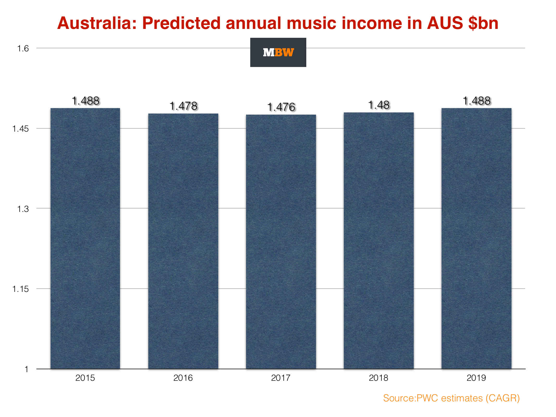 The entire Australian music market, encompassing physical, digital and live, is heading for five flat years, according to the annual outlook by Price Waterhouse Coopers (PwC).