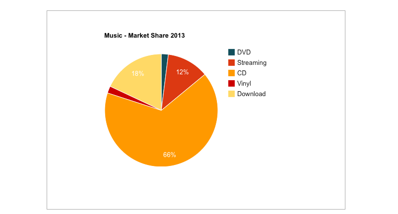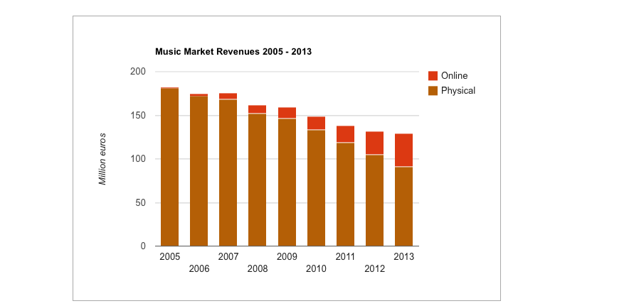 This has been driven by a huge drop in physical music sales income, down 13.3% in 2013 from the previous year to 91 million euros. Since 2005, revenues from physical product have halved in the country.