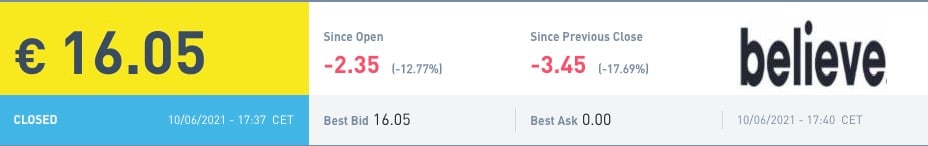 Believe opened on the Euronext today at €18.40 per share, and ended the day at €16.05.