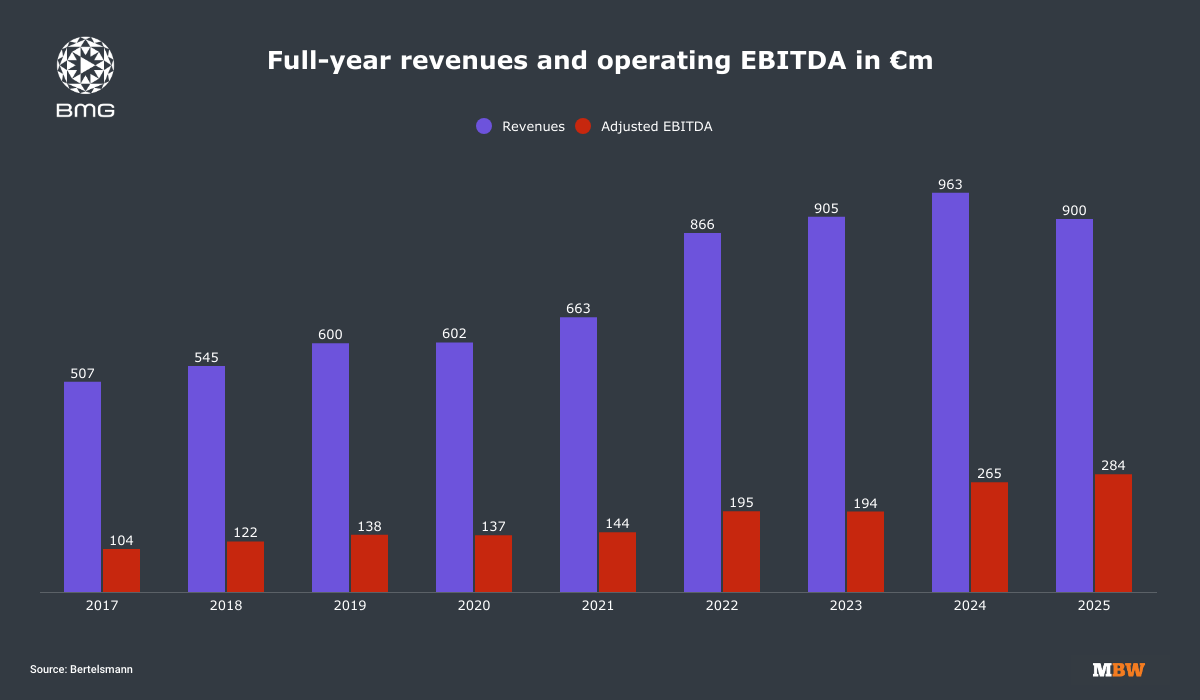 BMG generated EUR €900 million (USD $1.02bn) in annual revenues in 2025, down 6.5% YoY on a reported basis, or down 1.5% YoY on an organic basis.
