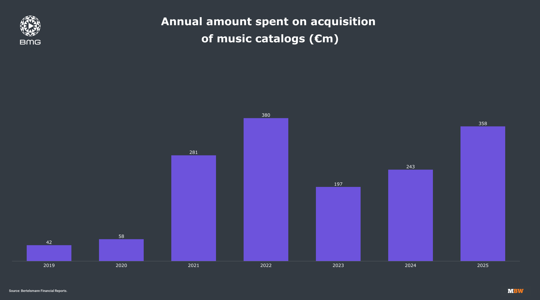 According to Bertelsmann’s annual report, BMG spent EUR €358 million ($405M) acquiring music catalogs in 2025 – a sharp increase from €243 million ($263M) in 2024, and the firm’s largest annual catalog investment on record.