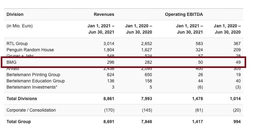 The €296 million haul – up 5.2% on a reported basis – represented a €14 million jump on the €282 million that BMG generated in the same six-month period of 2020.