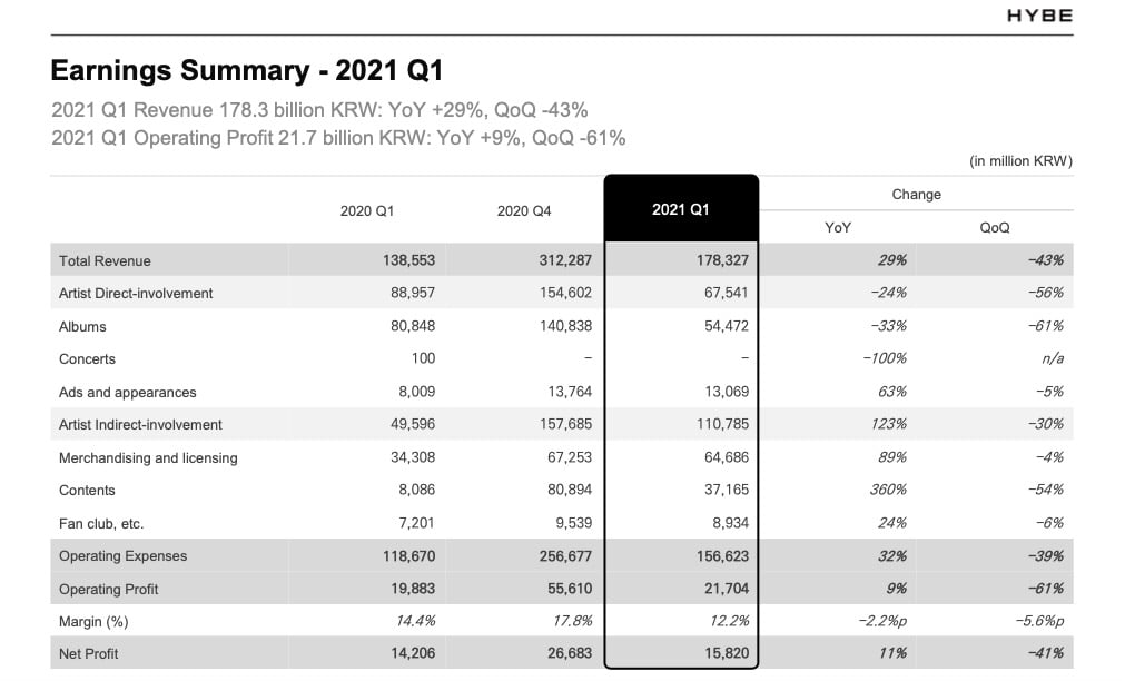 HYBE also posted a net profit of 15.8bn KRW ($14.2m), up 11% year-on-year, but down 41% compared to the prior quarter (Q4 2020).