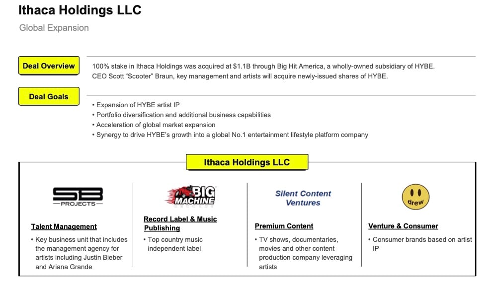 Also on the conference call, HYBE presented what it calls “a blueprint for creating business synergies” through its merger with Scooter Braun’s Ithaca Holdings, which saw Braun sell the entirety of his company – including SB Projects and Big Machine Label Group – to HYBE last month.