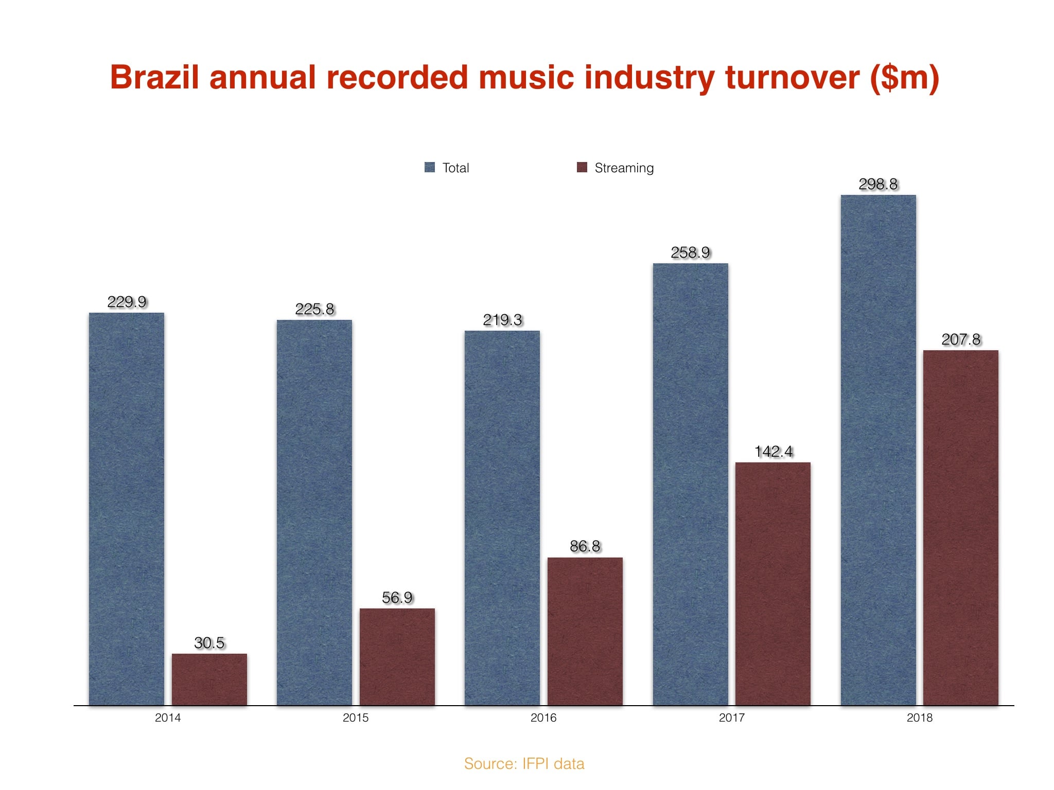 According to IFPI data, Brazil generated $298.8m for labels and artists in 2018 – up 15.4% YoY – of which some 70% ($207.8m) was derived from streaming platforms.