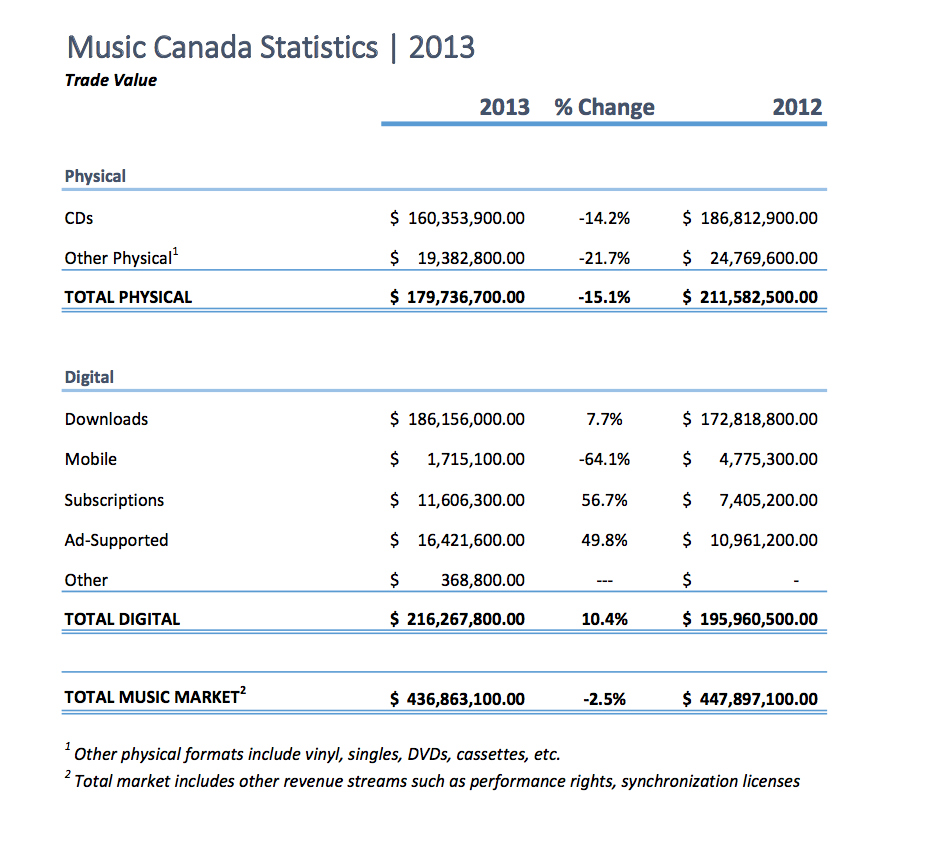 The income of Canada’s recorded music market dipped 2.5% in 2013, according to new stats from local trade body Music Canada.