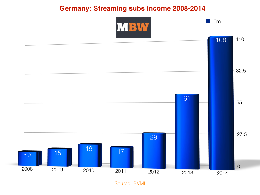Because of these streaming gains, digital music contributed €371m to the German recorded music industry in 2014, up 13.1% and now accounting for 25% of the overall business.