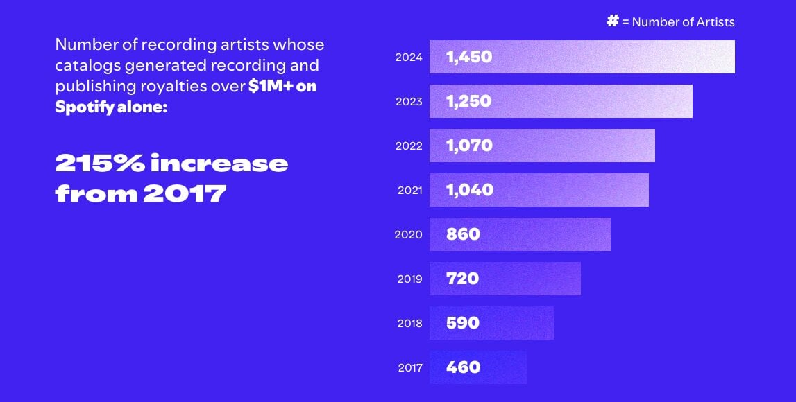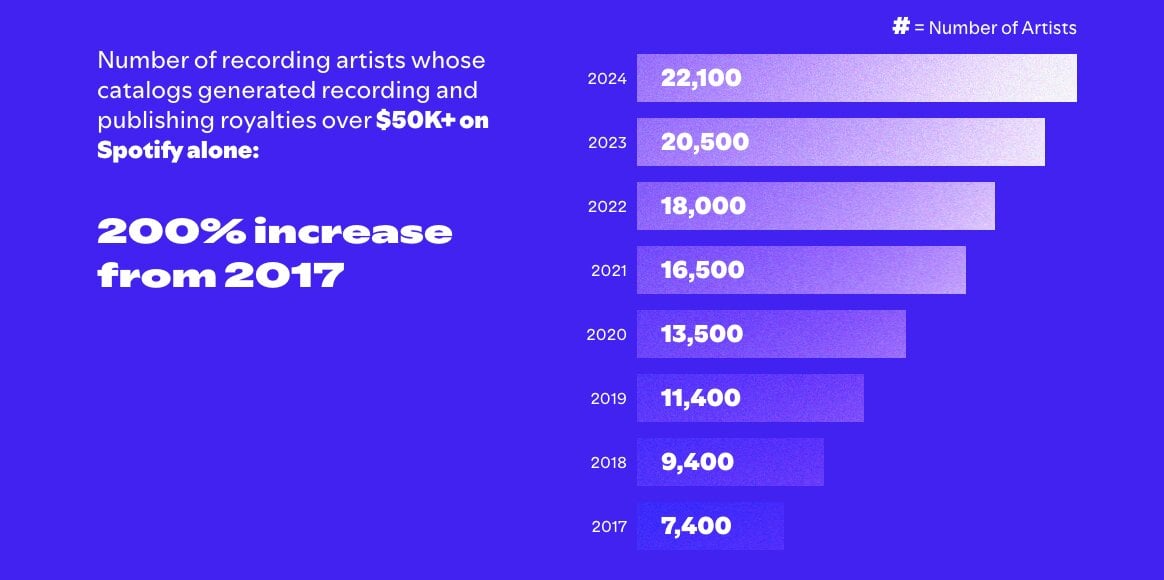 For example: 22,100 artists generated $50,000 or above in combined recording and publishing royalties from Spotify in 2024, up 200% from 2017 (when 7,400 artists generated $50,000+).