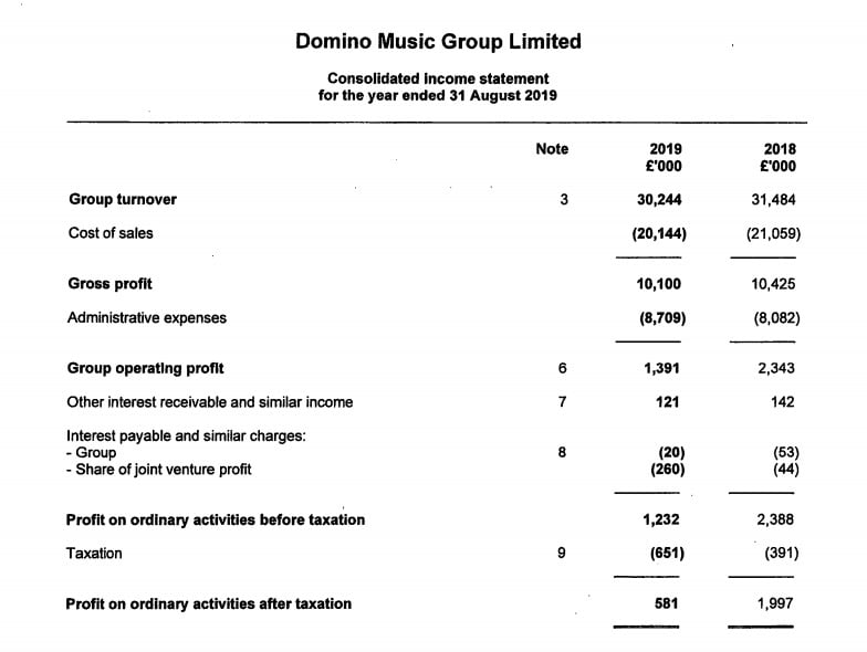 According to filings with UK Companies House, Domino Music Group Ltd generated £30.24 million in the 12 months to end of August 2019.
