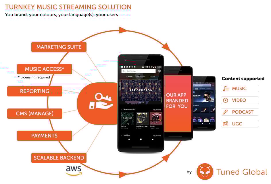 As their B2B music technology partner, Tuned Global offer them three major solutions. Our flagship product is a full turnkey solution, a fully branded music streaming app. That means we provide your mobile application(s) [front-end], your content management system, all the back end and all the reporting. These companies only have to focus on marketing and growth. We can usually launch a service in less than eight weeks using this solution.