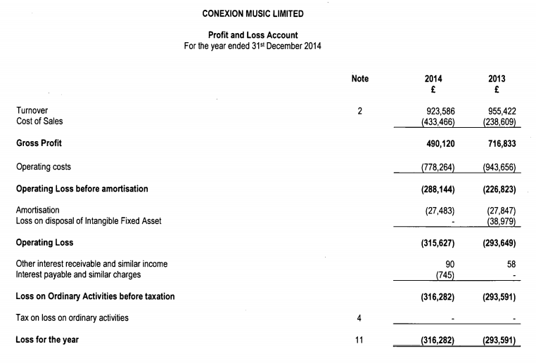 According to its latest accounts filings with Companies House, Conexion Music Ltd lost £316,282 in 2014.