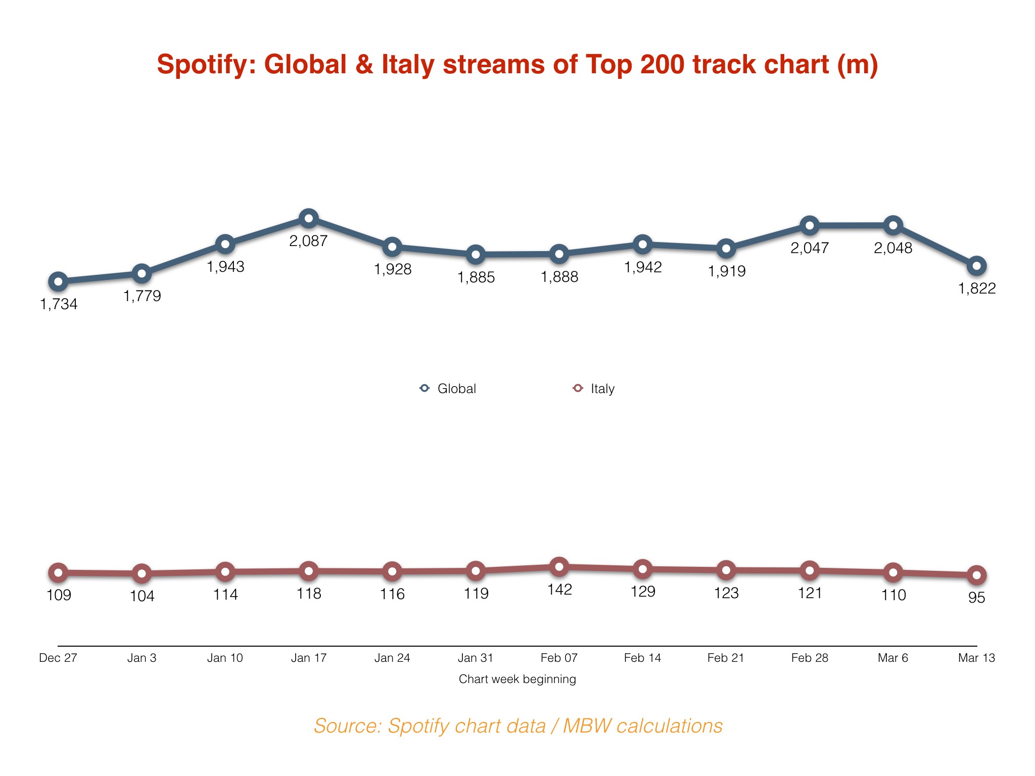 In the end, that was a slightly keen forecast: the final tally of all global streams within Spotify’s Top 200 chart last week (from Friday, March 13 to end of Thursday 19) was 1.822bn streams, down by 226m plays – or 11.0% week-on-week.