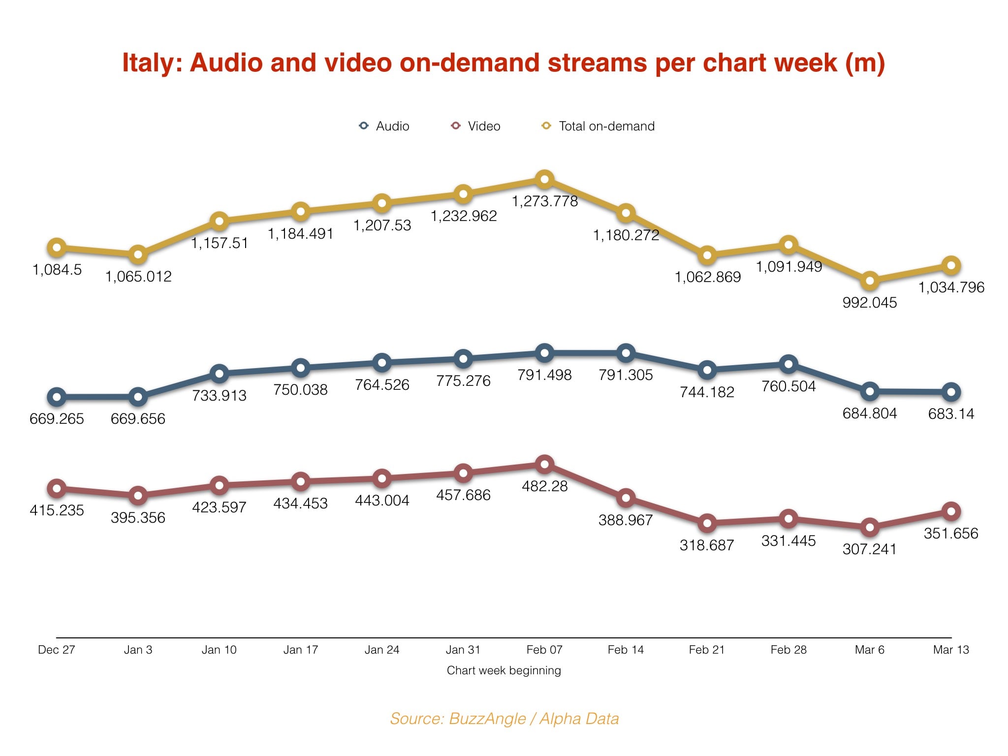 Alpha Data / BuzzAngle has also been tracking Italy’s video streams (from YouTube) as well as on-demand audio streams in the country.