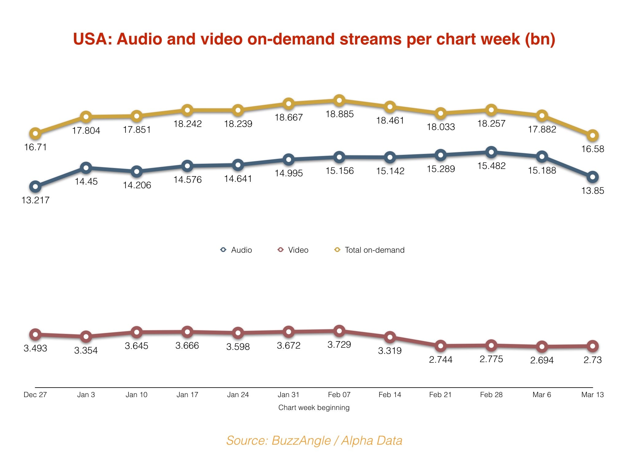 In the chart week beginning March 19, says Alpha Data, interactive music video streams in the US climbed 1.3% to 2.73bn.