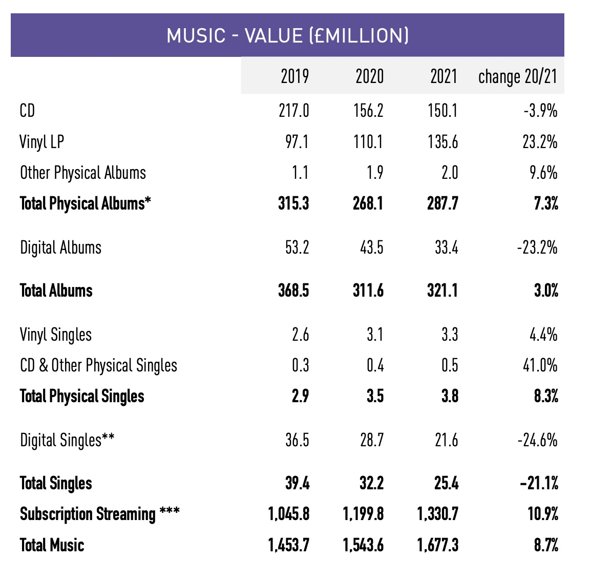 Sales of CDs fell 3.9% YoY, from £156.2 million in 2020, to £150.1 million in 2021 (see below).