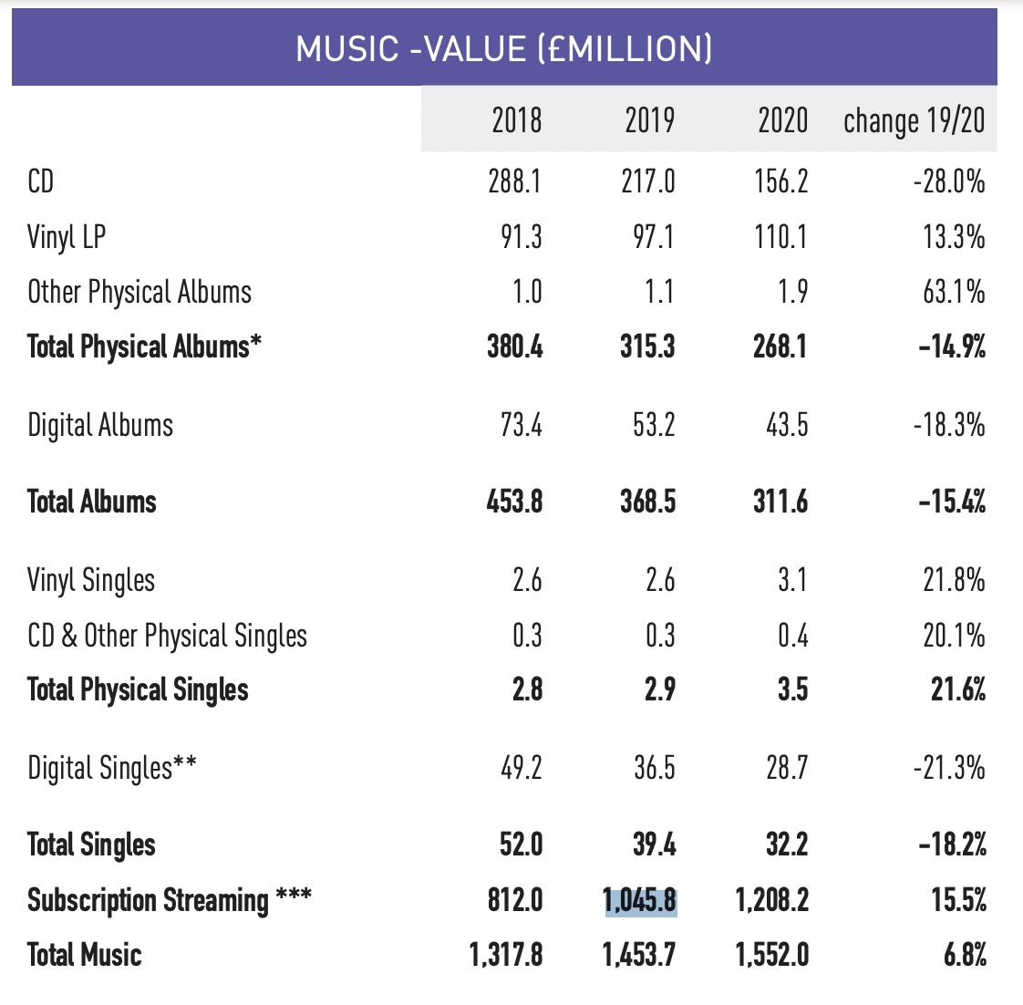 In 2020, UK music subscription streaming revenues grew 15.5%, with a total spend by consumers of £1.208bn ($1.55bn), an increase of £162.4 million ($xm).