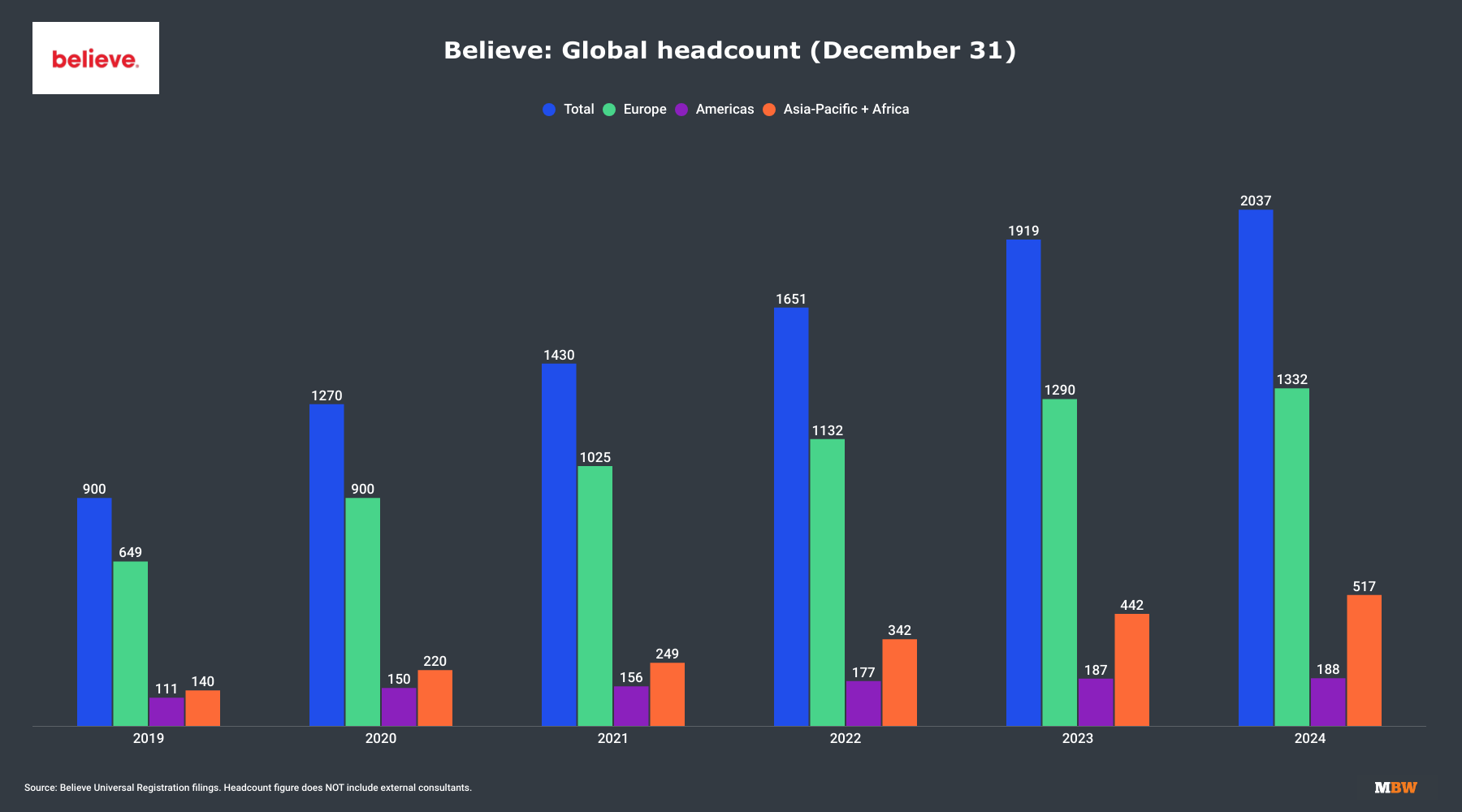 Via its annual registration document with the French financial authorities, Believe reveals its global employed headcount.