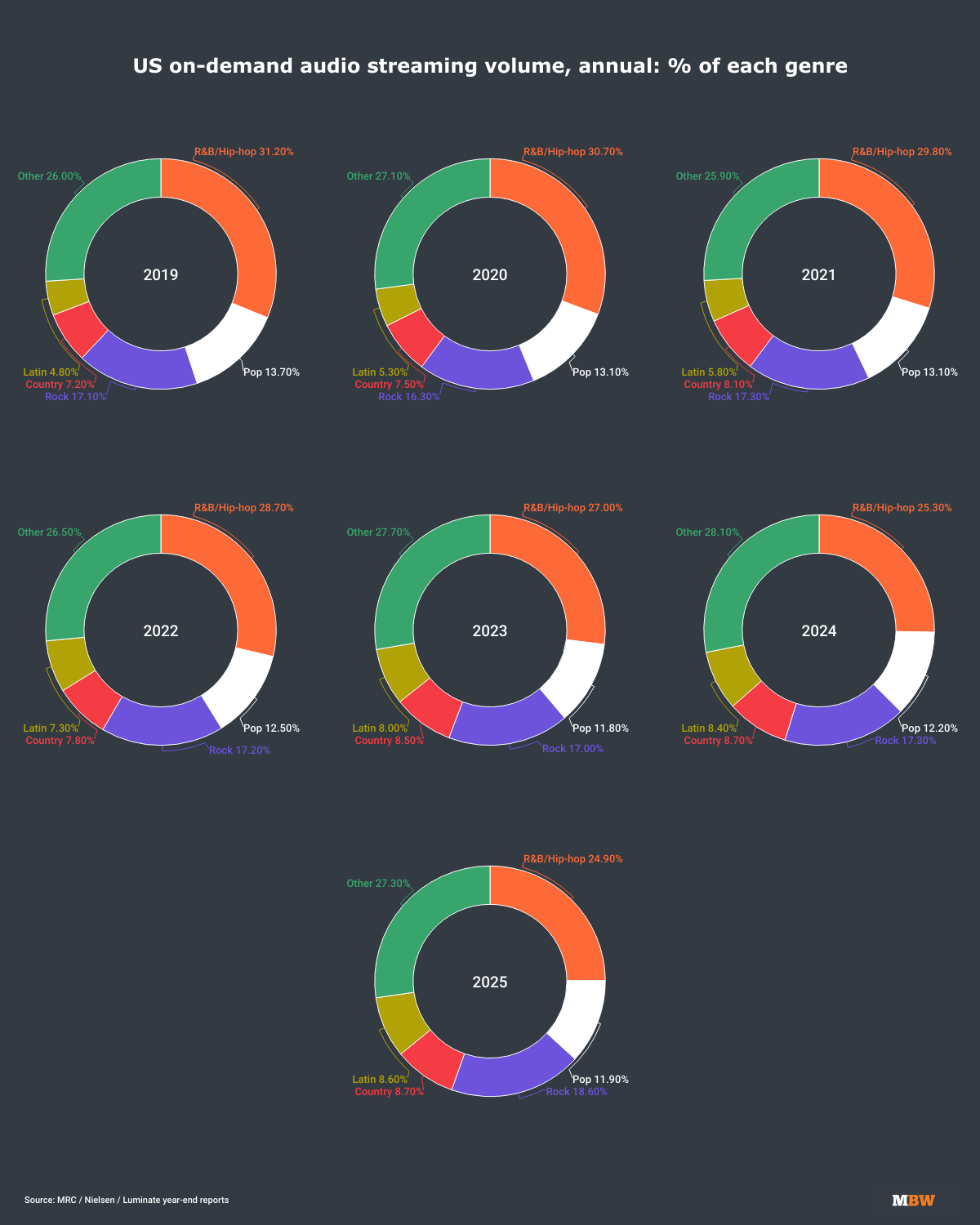 Genre split of total on-demand audio streams in the US (annual), via Luminate (2019-2025)