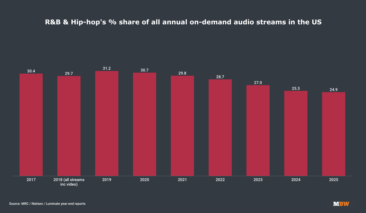 Beneath this, you can find a chart focusing on just one genre within these parameters, defined by Luminate and MRC etc. as ‘R&B/hip-hop’.