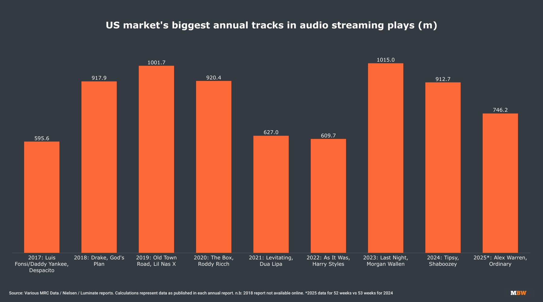 Additionally, you can see a chart showing the No.1 audio on-demand streaming track in each year, with total audio plays.