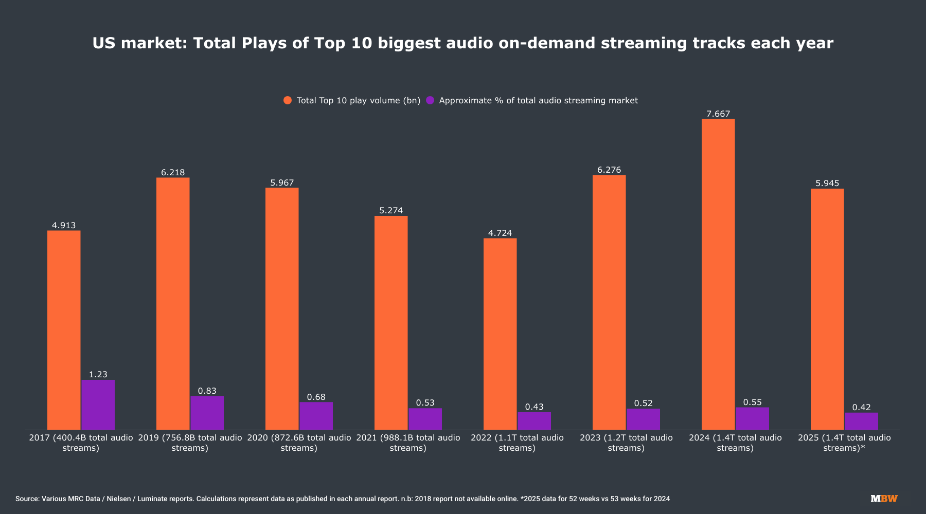 Market share of Top 10 streaming hits in the US, full-year, via Luminate/Nielsen (2017-2025)