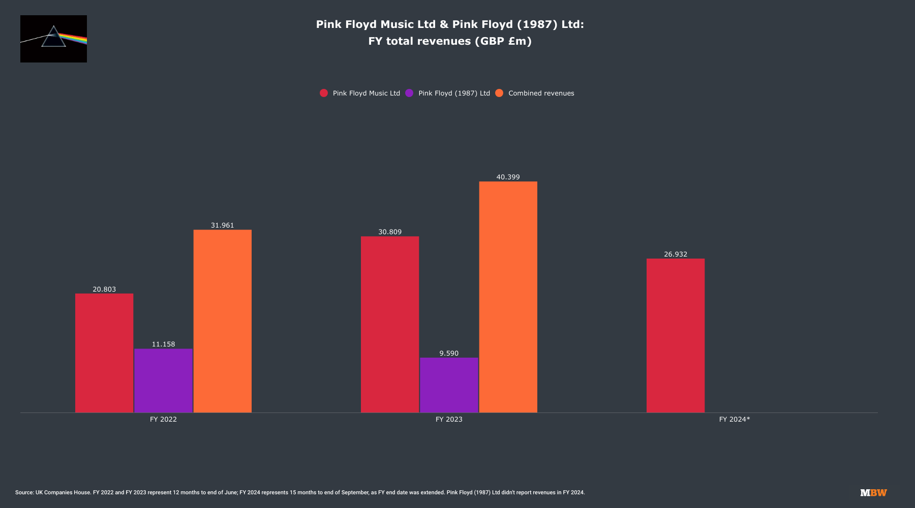 Below you can see a data visualization of the annual royalty income of the two Floyd UK companies in FY 2022 and 2023 (ending June 30 in each 12-month period), prior to the Sony sale.