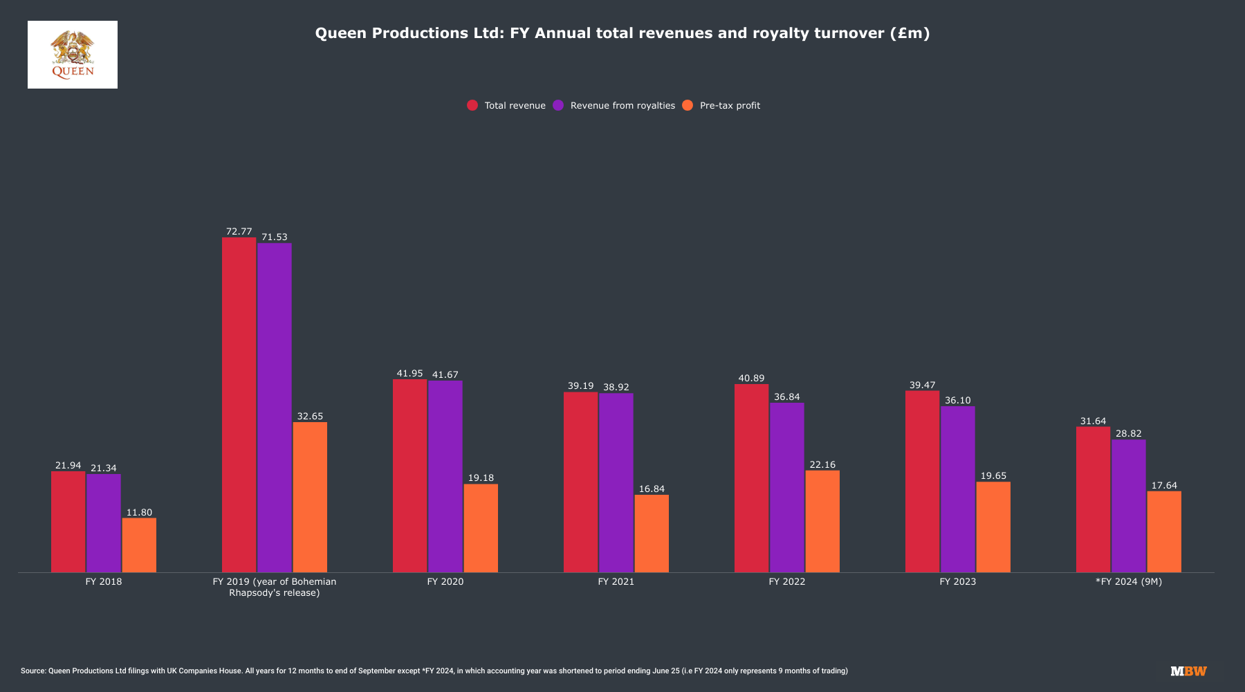 Each year, the group’s music rights revenues have traditionally been publicly reported by its primary UK company, Queen Productions Ltd. (This does not include live concert revenues.)