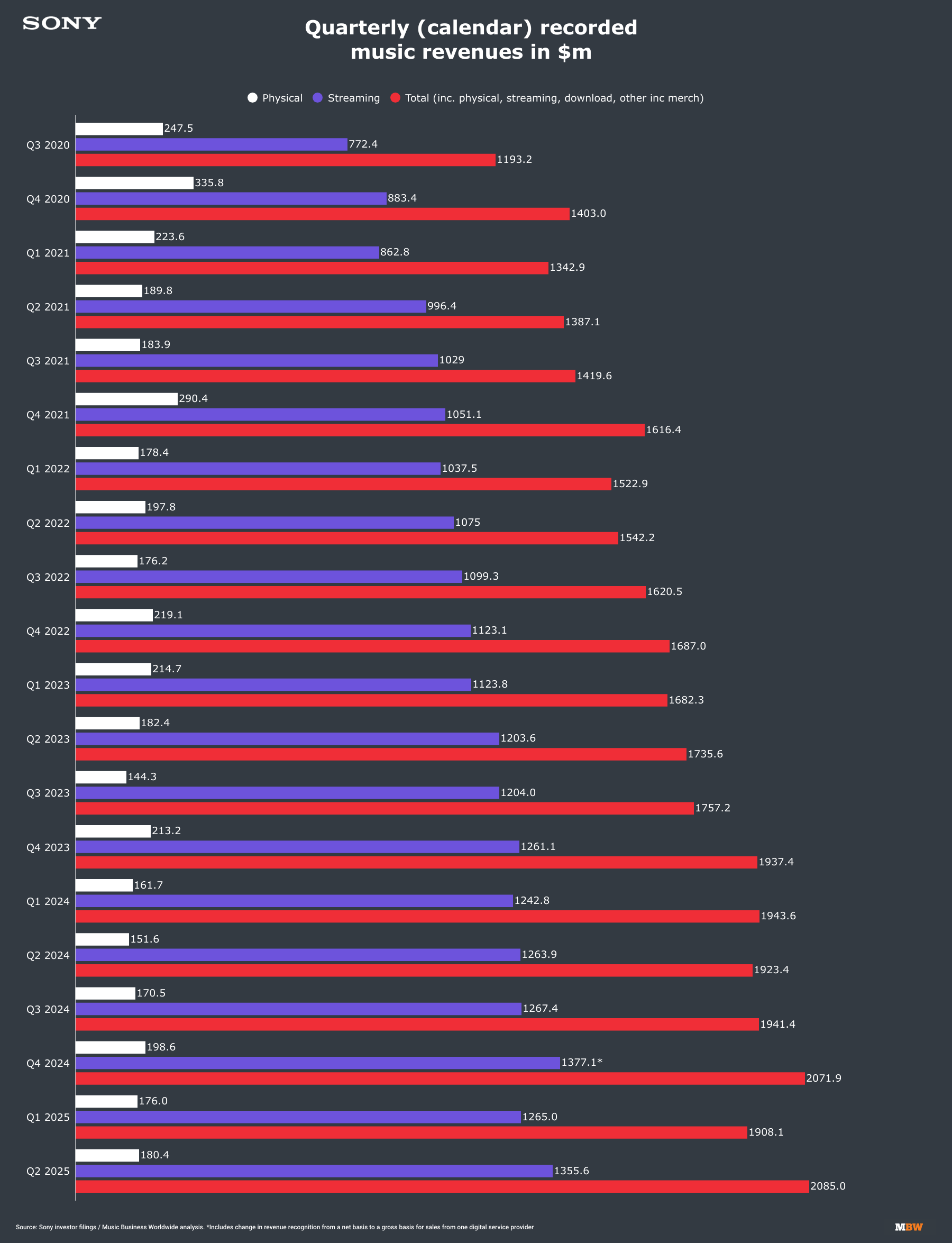 Below, we’ve focused on only the recorded music part of Sony’s global operation, covering both the New York-HQ’d Sony Music Entertainment plus Sony’s separately-run recorded music operation in Japan.