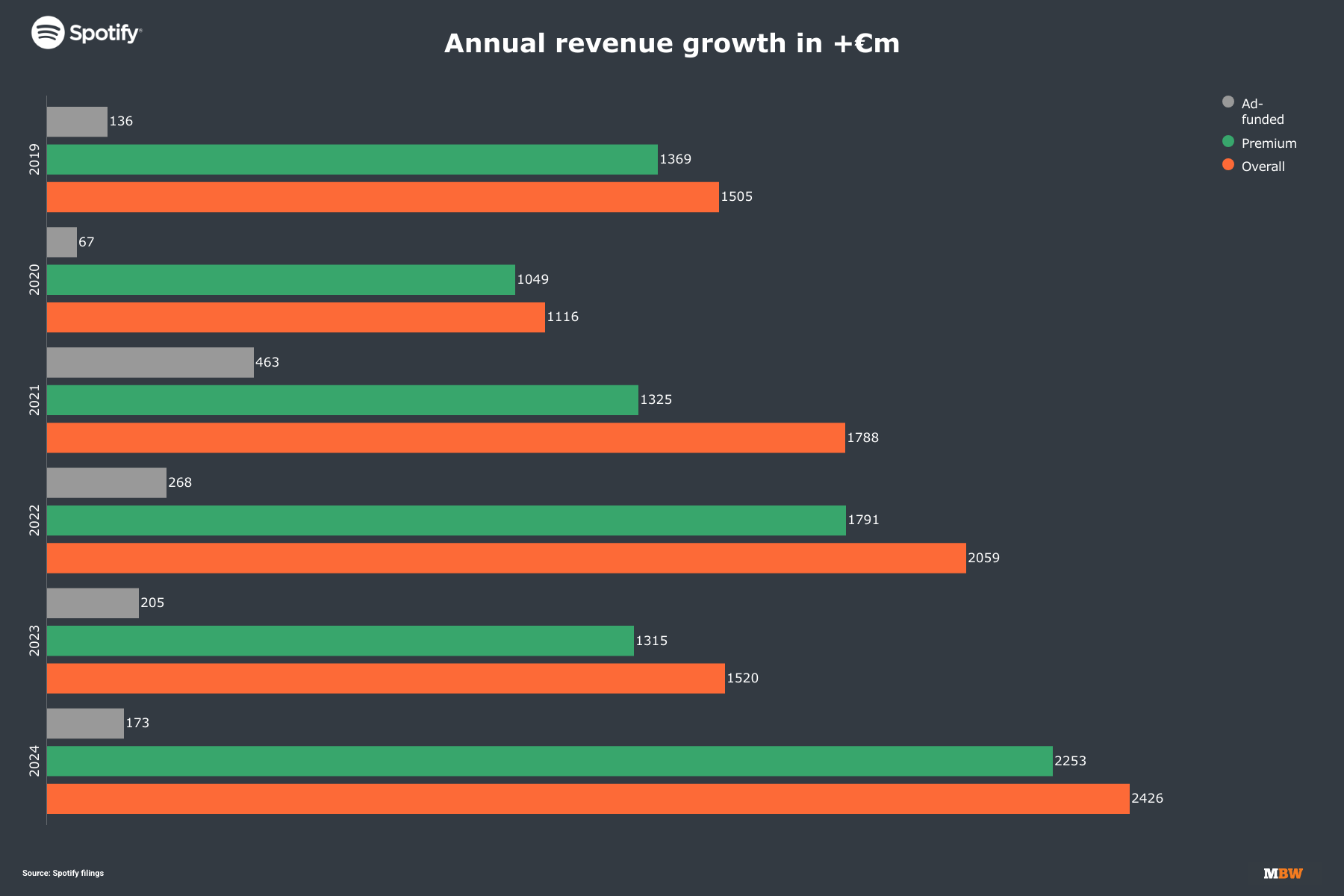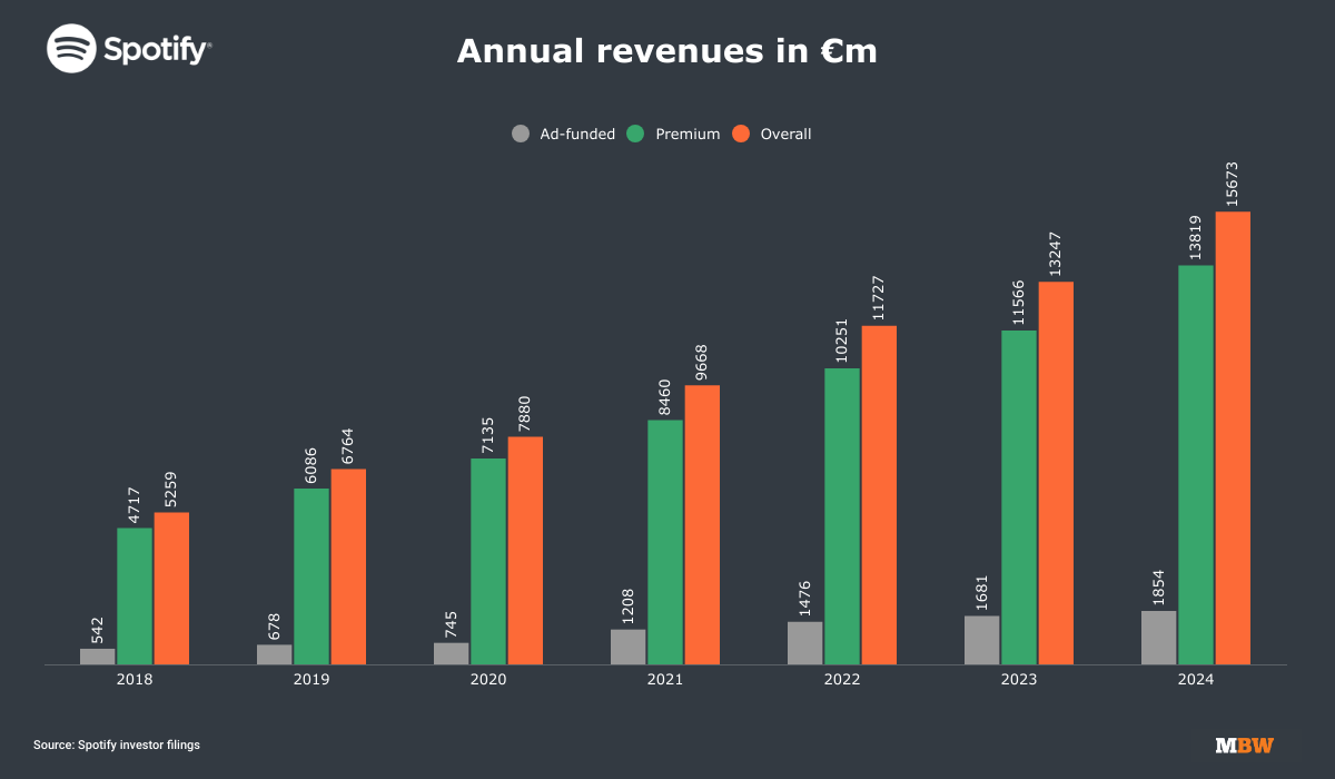 Below you can see how the company closed Q4 in each of the disp¢layed years in terms of annual revenues (from Jan-Dec). Spotify reports these figures in EUR.