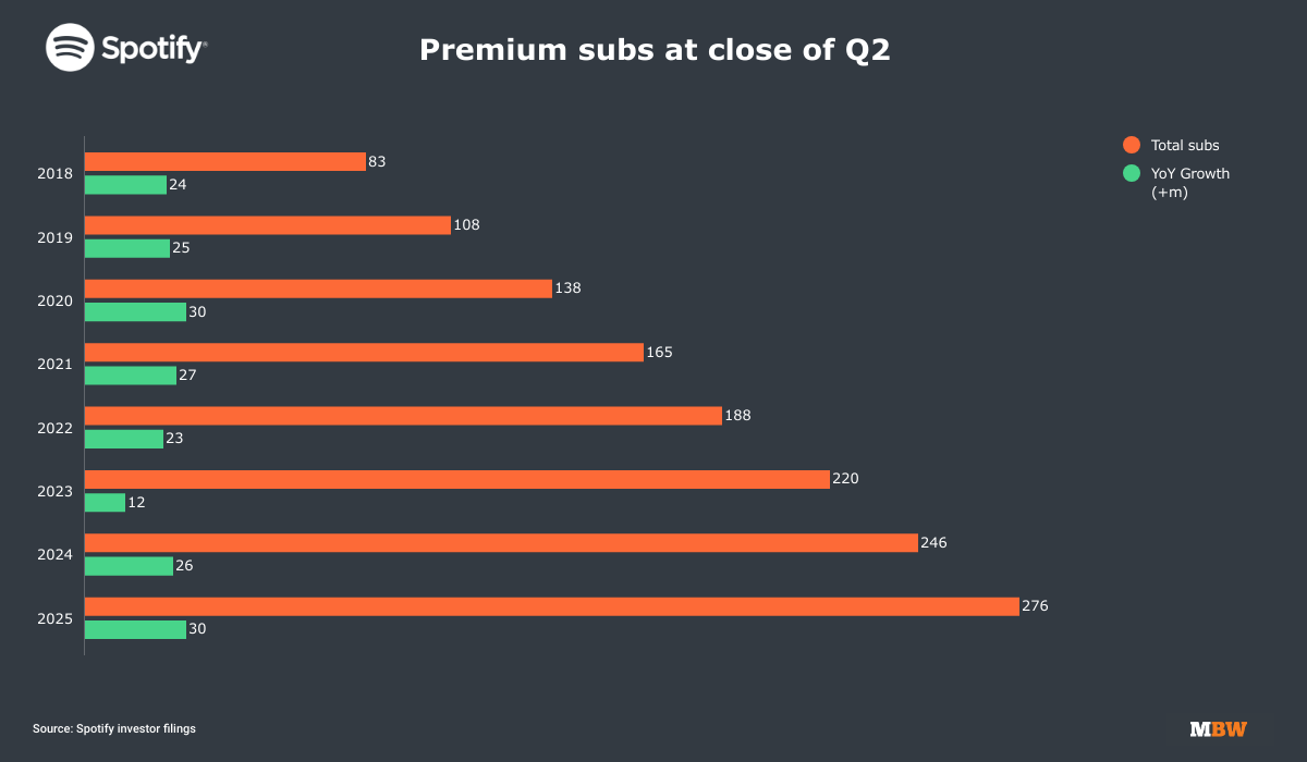 The following chart shows SPOT’s global paid subscriber reach in Q2 of each year (to end of June), inclusive of its YoY subscriber growth figure.