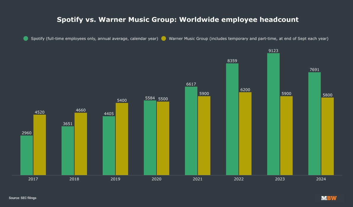 Warner’s headcount number includes temporary and part-time staff, as of the end of its FY. Spotify’s number is an annual average figure, and only includes full-time staff.