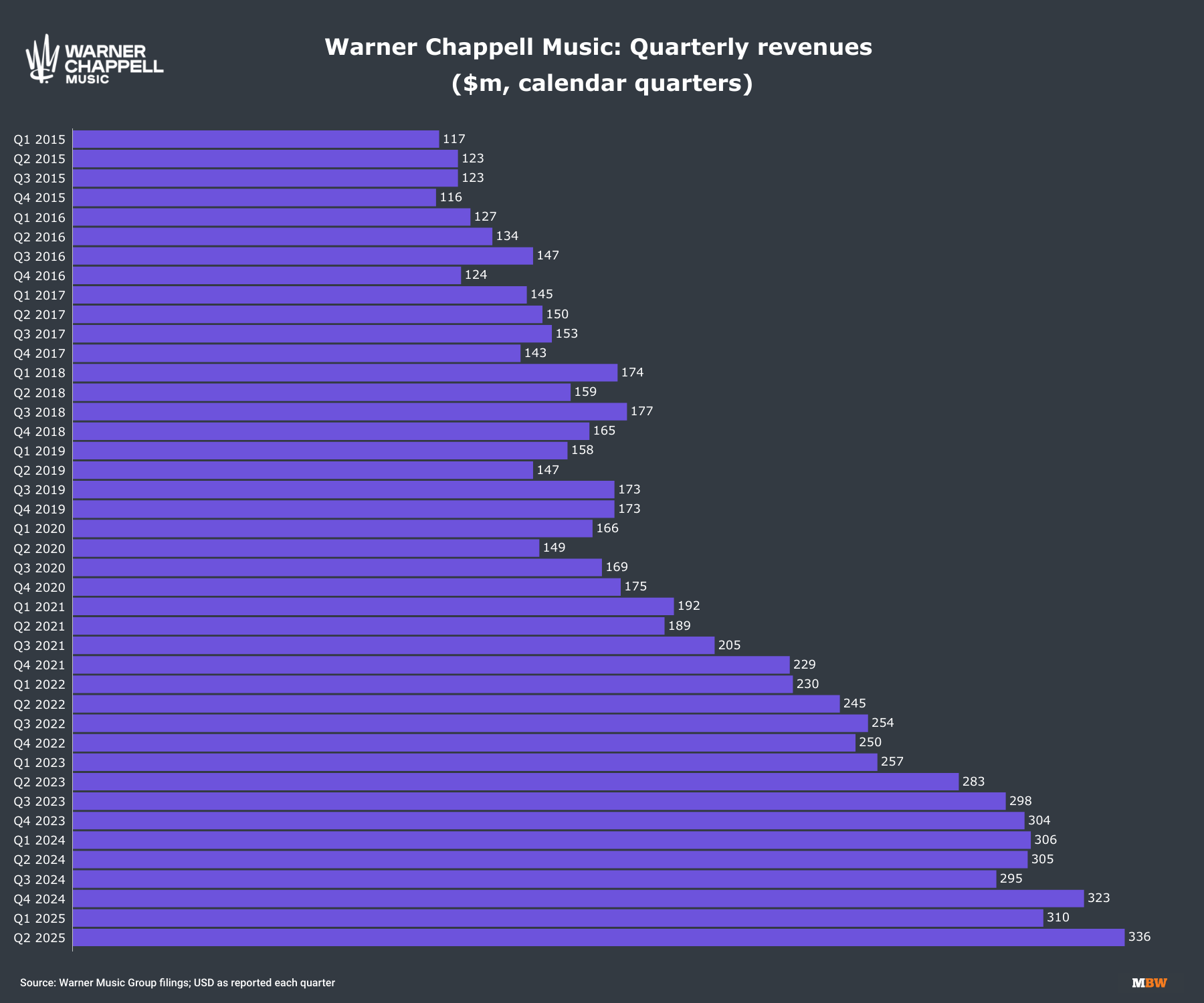 Below, you can see a data visualization for Warner Chappell’s global quarterly revenues going back to 2015.