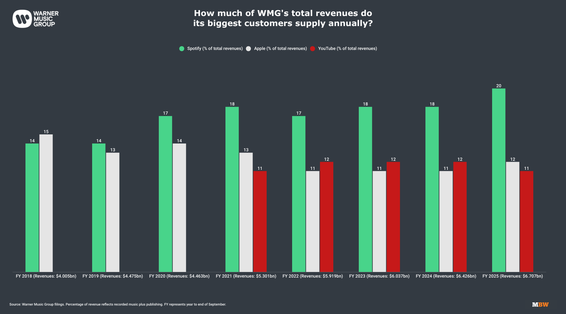 Within this filing, Warner reveals the total percentage of its annual revenue that comes from certain industry partners, including Spotify and YouTube.
